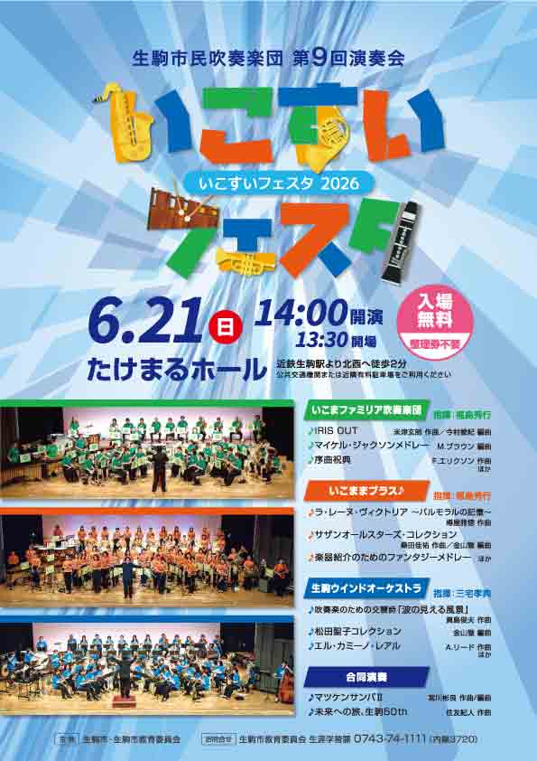 | 奈良県生駒市によって設立された生駒市民吹奏楽団の中の本格市民バンドである、生駒ウインドオーケストラの公式ページです。 最新情報などは上記の「活動報告」又は下記のフェイスブック 生駒ウインドオーケストラ公式ページをご確認下さい What's New |